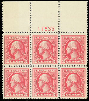 528, Mint 2¢ XF LH Top Plate Block of Six CV $100.00 - Stuart Katz