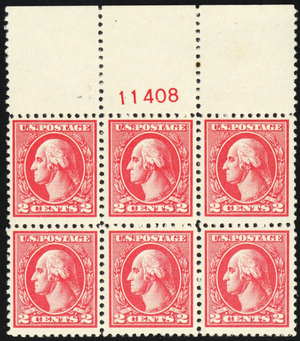 528, Mint VF NH 2¢ WIDE Top Plate Block of Six - Tilted PL# * Stuart Katz