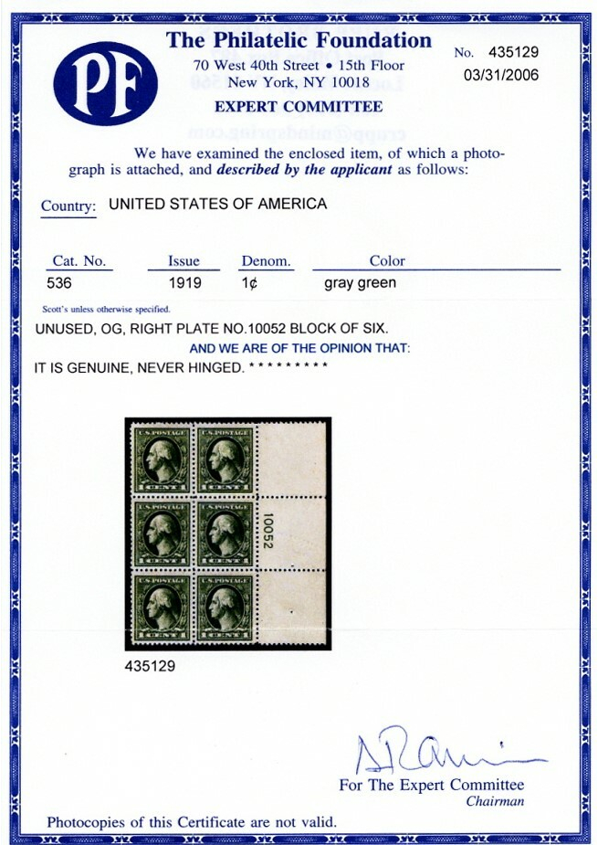 536, Mint XF NH Plate Block of Six With PFC Certificate - Stuart Katz