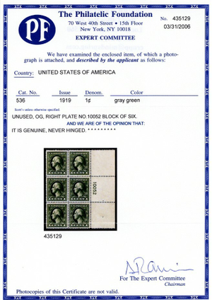 Due to the high cost of obtaining certificates we will only refund the cost of the stamp and not the cost of the certificate for stamps that sell for less than $250 that come back with a negative certificate. Stamps that sell for above $250 will receive a full refund for both the price of the stamp and cost of the certificate if it should come back not as described. For U.S. stamps only certificates from either APS, PSE or from the Philatelic Foundation are accepted, however "graded" certificates or "encased" items are not accepted.