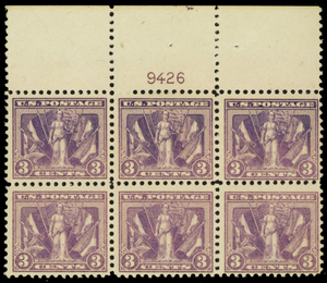 537, Mint F/VF LH 3¢ Top Plate Block of Six Stamps * Stuart Katz
