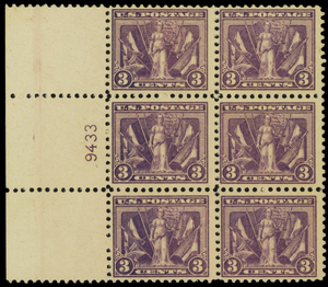 537, Mint FVF LH 3¢ Top Plate Block of Six Stamps - Stuart Katz