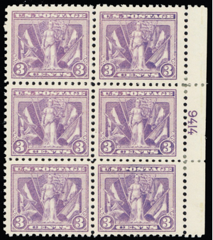 537, Mint H 3¢ VF Plate Block of Six Stamps CV $260 - Stuart Katz