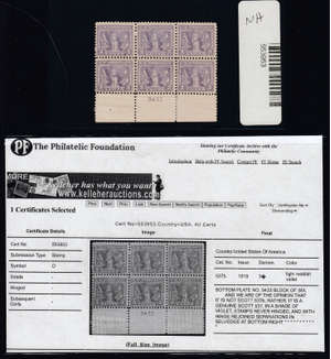 The catalogue value is $350 for never hinged and $260 for hinged. This plate block was originally accompanied by a P.F. certificate; however, the certificate was lost many years ago. A printout from the P.F. website is included to confirm the authentication of the plate block.