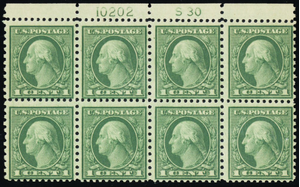 538, Mint NH 1¢ Plate Block of Eight Stamps CV $252 - Stuart Katz