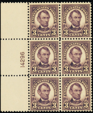 555, Mint VF NH 3¢ Lincoln Plate Block of Six - Stuart Katz