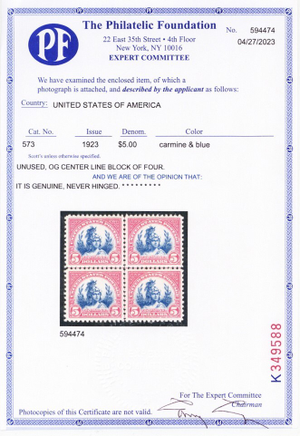 573, Mint NH Superb $5 Center Line Block With PFC Certificate * Stuart Katz