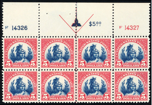573, Mint VF/XF NH $5 - Plate Block of Eight Stamps * Stuart Katz