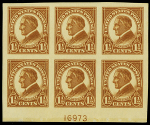 576, Mint XF NH 1-1/2¢ Bottom Plate Block of Six Stamps - Stuart Katz