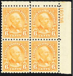 587, Mint VF/XF NH 6¢ - Plate Block - Well Centered - Stuart Katz