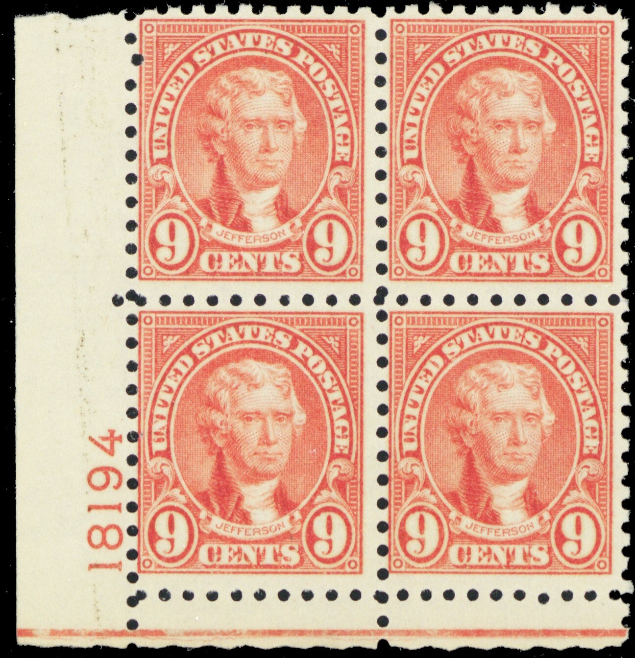 590, Mint 9¢ F/VF NH Plate Block of Four CV $225.00 - Stuart Katz