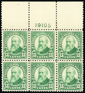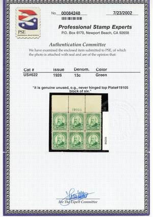 622, Mint VF/XF NH 13¢ - WIDE TOP Plate Block of Six - PSE - Stuart Katz