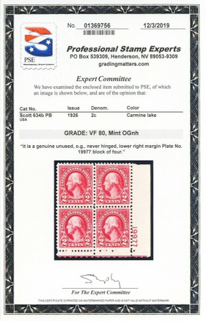 634b, VF NH VERY RARE Carmine Lake Plate Block Of Four With PSE - Stuart Katz