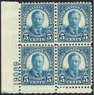 | #637 XF MNH OG-5¢ ROOSEVELT PLATE BLOCK-LL Position (REM #637-pbC) VF MNH OG plate block of Scott #637 5-cent Teddy Roosevelt rotary press printing Lower Left position. Very fresh color and nice shade.