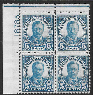 VF MNH OG plate block of Scott #637 5-cent Teddy Roosevelt rotary press printing Upper Left position. Very fresh color and nice shade.