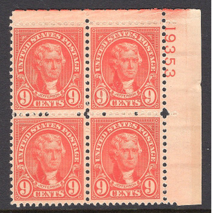 XF Hinged OG plate block of Scott #641 9-cent Thomas Jefferson rotary press printing. Very fresh color and nice dark shade.