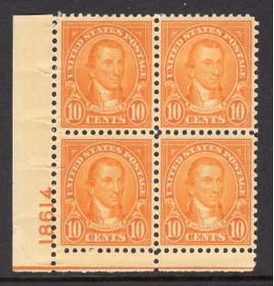 VF-XF MNH OG plate block of Scott #642 10-cent James Madison rotary press printing. Very fresh color, good Margins and nice shade.
