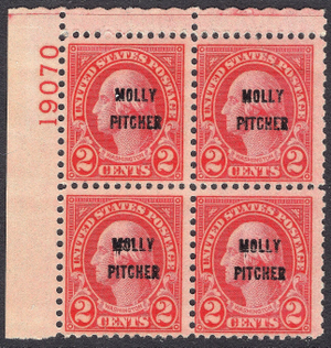 | #646 F-VF MNH OG-2¢ MOLLY PITCHER OVERPRINT PLATE BLOCK-UR Position #646 F-VF MNH OG-2¢ MOLLY PITCHER OVERPRINT PLATE BLOCK-Upper Right Position . Very fresh color and nice shade. Nice centering for this typically poorly centered issue.