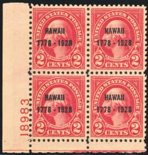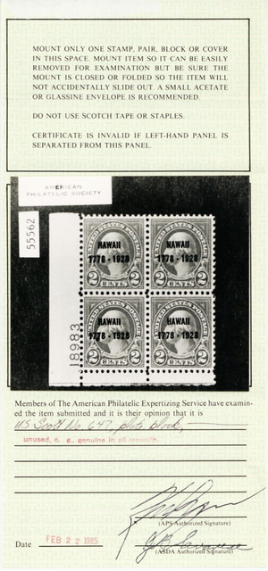 647, Mint VF/XF NH 2¢ Hawaii Plate Block With APS Certificate Stuart Katz