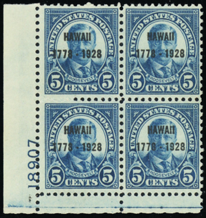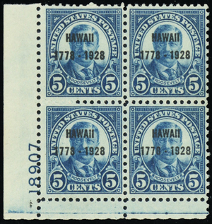 648, Mint VF NH 5¢ Hawaii Plate Block of Four - Stuart Katz