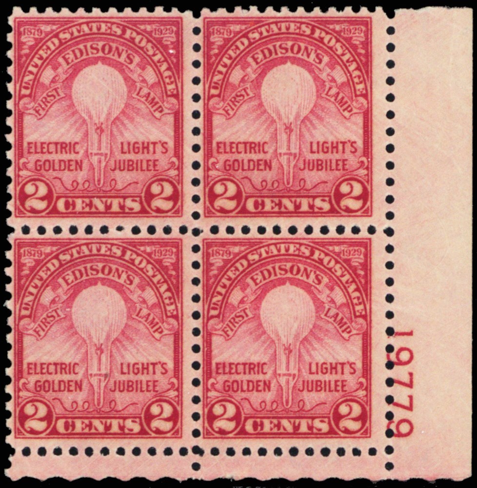655, MNH 2¢ Edison Light Plate Block of Four Stamps Cat $50.00 - Stuart Katz