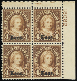 662, Mint VF NH 4¢ Kans Plate Block of Four Stamps Cat $300.00 - Stuart Katz