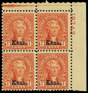 667, Mint LH 9¢ Kansas Plate Block of Four - Stuart Katz