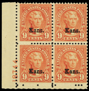 667, Mint NH 9¢ Kansas Plate Block of Four - Stuart Katz