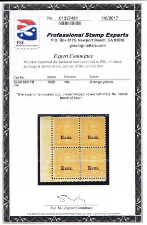 668, Mint VF NH 10¢ - Kansas Plate Block PSE Certificate - Stuart Katz
