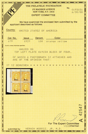 Due to the high cost of obtaining certificates we will only refund the cost of the stamp and not the cost of the certificate for stamps that sell for less than $250 that come back with a negative certificate. Stamps that sell for above $250 will receive a full refund for both the price of the stamp and cost of the certificate if it should come back not as described. For U.S. stamps only certificates from either APS, PSE or from the Philatelic Foundation are accepted, however "graded" certificates or "encased" items are not accepted.