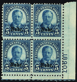 674, Mint LH 5¢ Nebr Plate Block of Four SCV $300.00 * Stuart Katz
