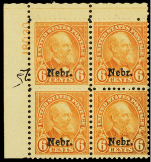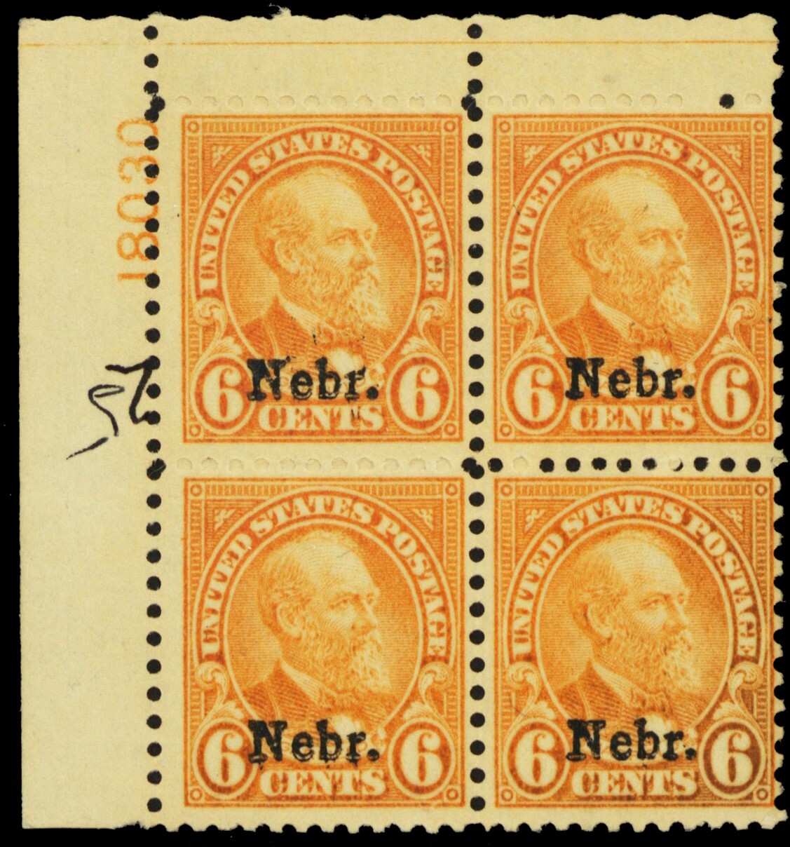 675, Mint NH 6¢ Nebraska Plate Block of Four CV $750 - Stuart Katz