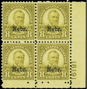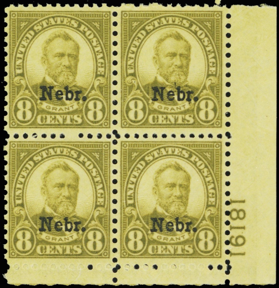 677, Mint XF NH Plate Block 8¢ Nebraska Cat $550.00 - Stuart Katz