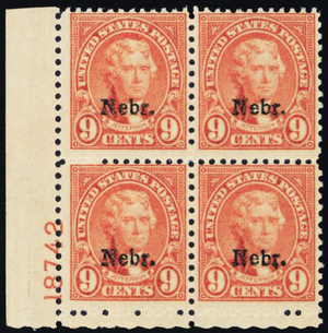 678, Mint NH 9¢ Nebr Plate Block of Four SCV $700.00 * Stuart Katz