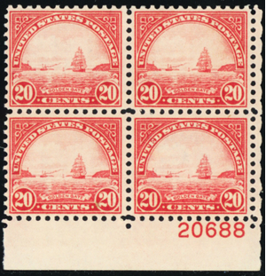 698, Mint VF NH 20¢ Plate Block of Four SCV $60 - Stuart Katz