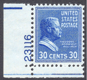 Scott #830 Superb MNH OG 30c Roosevelt stamp from the Presidential series Plate # single with great margins. Terrific Centering. Get this one into your collection now. Gum is perfect. It's a beauty!