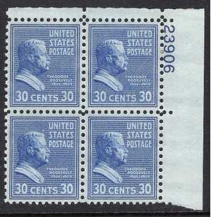 Scott #830 Superb MNH OG Upper right plate block of 4 of  the 30c Roosevelt stamp from the Presidential series with great margins. Terrific Centering. Get this one into your collection now. No Gum skips
