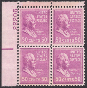 | #831 VF HInged OG--50 cent William Howard Taft UL PLATE BLOCK-Presidential series Scott #831 VF Hinged in selvage OG Upper Left plate block of 4 of the 50c William Howard Taft stamp from the Presidential series with great margins. Terrific Centering. Get this one into your collection now. No Gum skips