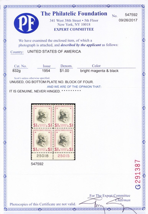 832G, Mint XF NH $1 Bright Magenta & Black Plate Block PFC Cert * Stuart Katz