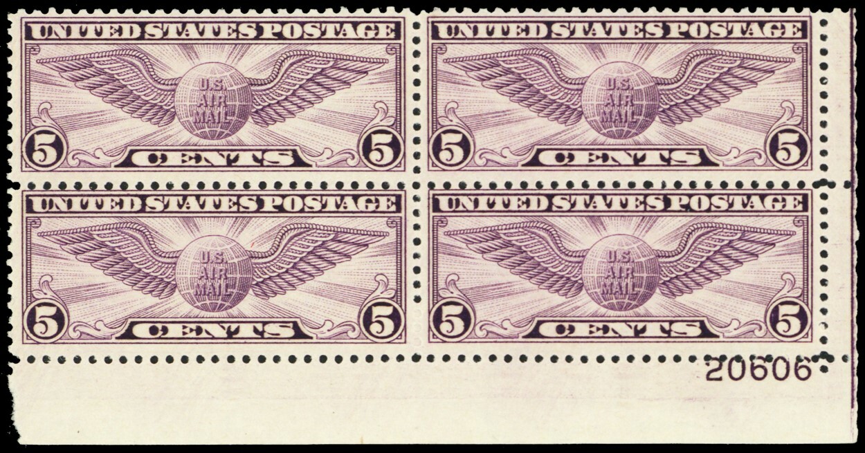 C16, Mint F/VF NH 5¢ Airmail Plate Block of Four CV $95 -- Stuart Katz