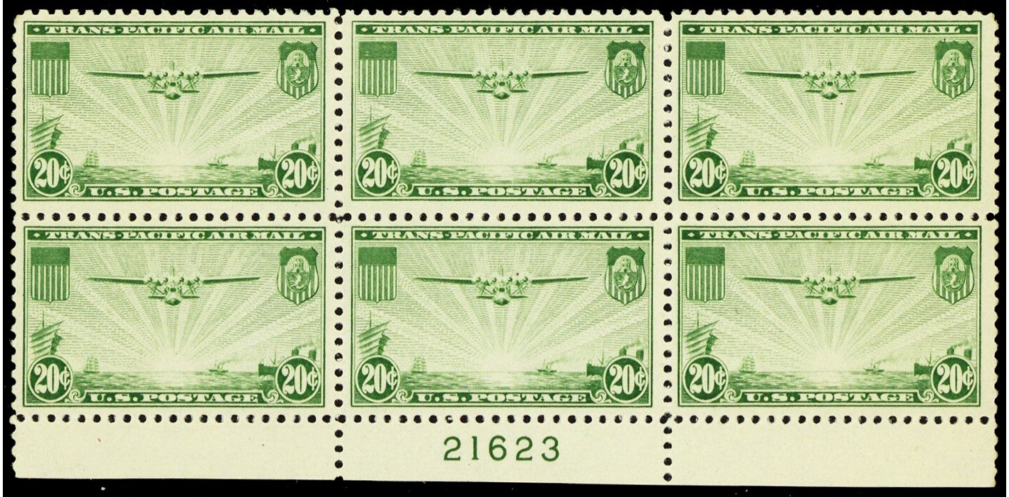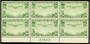 C21, Mint VF NH 20¢ BottomPlate Block of Six Stamps - Stuart Katz