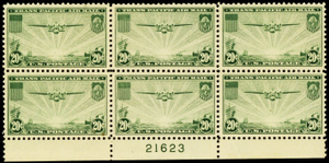 C21, Mint VF NH 20¢ BottomPlate Block of Six Stamps -- Stuart Katz