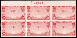C22, Mint F/VF NH 50¢ Top Plate Block of Six Stamps ^^ Stuart Katz