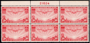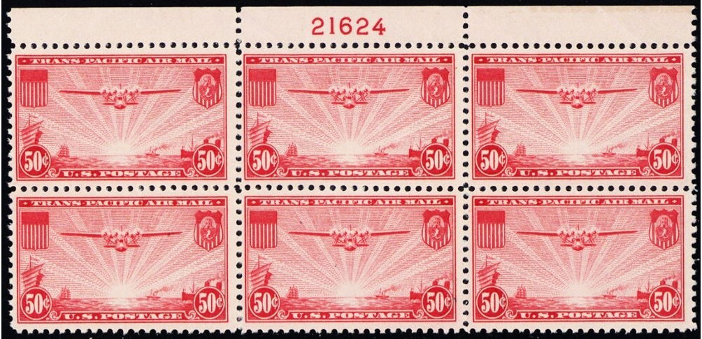 C22, Mint FVF NH Top Plate Block of Six Stamps CV $85 - Stuart Katz