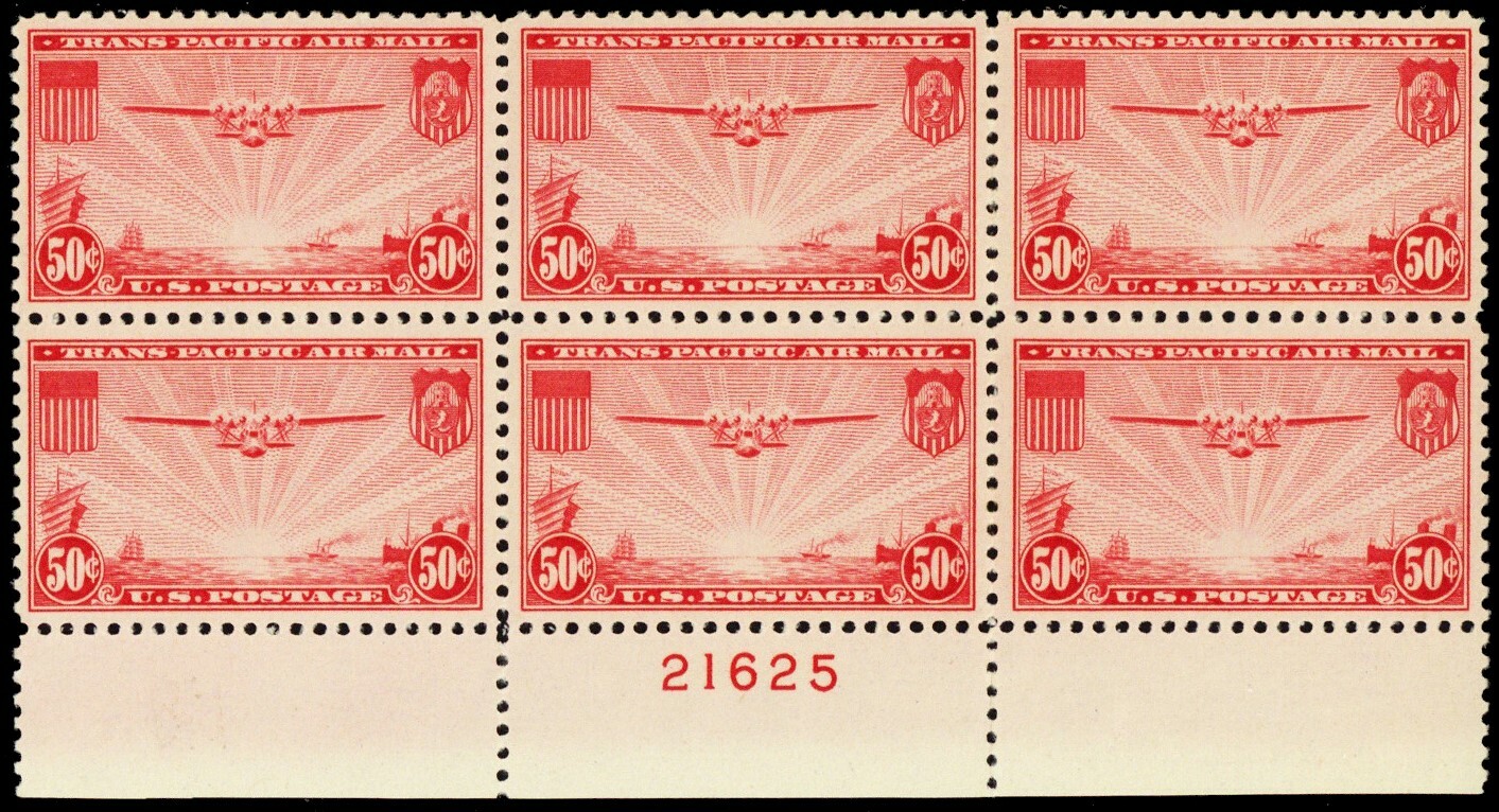 C22, Mint VF NH 50¢ Bottom Plate Block of Six Stamps -- Stuart Katz