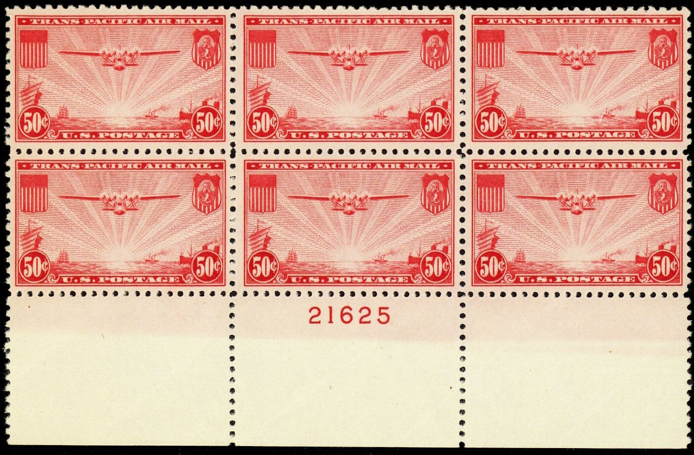 C22, Mint VF NH 50¢ Bottom Plate Block of Six Stamps -- Stuart Katz