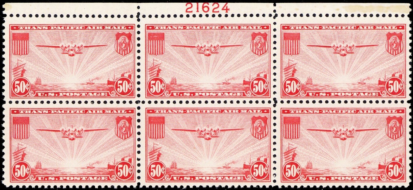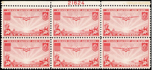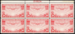 C22, Mint VF NH 50¢ Top Plate Block of Six Stamps --****- Stuart Katz