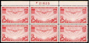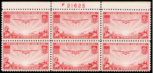 C22, Mint VF NH 50¢ Top Plate Block of Six Stamps ^ Stuart Katz