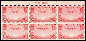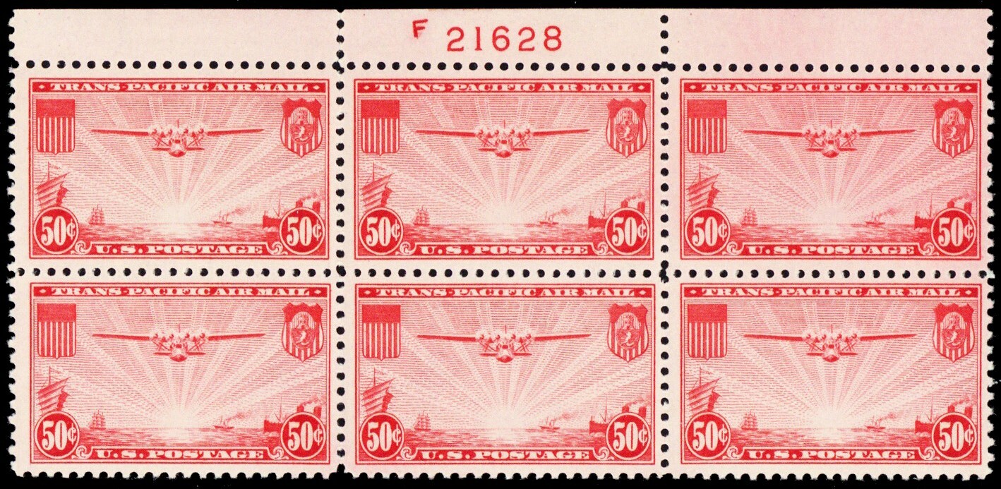 C22, Mint VF NH 50¢ Top Plate Block of Six Stamps -- Stuart Katz
