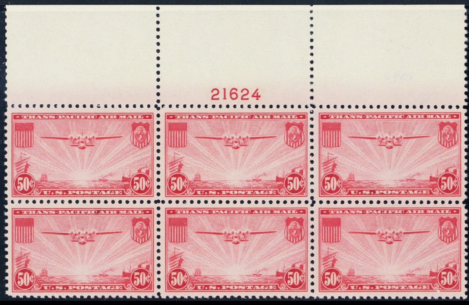 C22, Mint XF NH 50¢ - RARE WIDE TOP Plate Block of Six - Stuart Katz